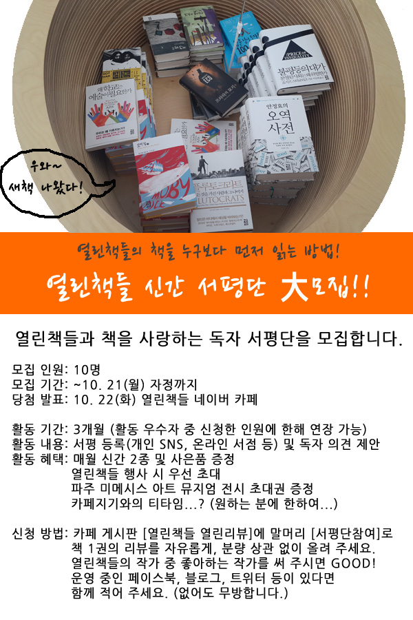 10. 21(¿ù) ÀÚÁ¤±îÁö [¿¸°Ã¥µé ¿¸°¸®ºä] °Ô½ÃÆÇ¿¡ Ã¥ 1±ÇÀÇ ¸®ºä¸¦ ºÐ·®¿¡ »ó°ü ¾øÀÌ ÀÚÀ¯·Ó°Ô Àû¾î ¿Ã·Á ÁÖ¼¼¿ä.